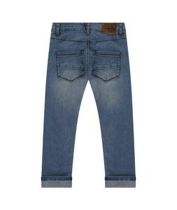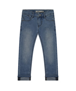 Ultra soft & stretchy with the perfect slim fit that makes your little boy look so sharp! Medium blue washed denim with classic five pocket styling, belt loops & adjustable waist for the perfect fit. Ultra slim fit silhouette with faux button fly, hidden hook & eye closure & zip fly.