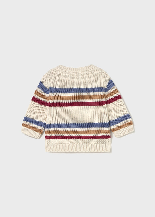 Chunky knit sweater with pops of primary colored stripes to give your little one a boost of color! Rounded neckline with full length sleeves, double button fastening on the shoulder in a pullover design. Midweight 100% Cotton.
