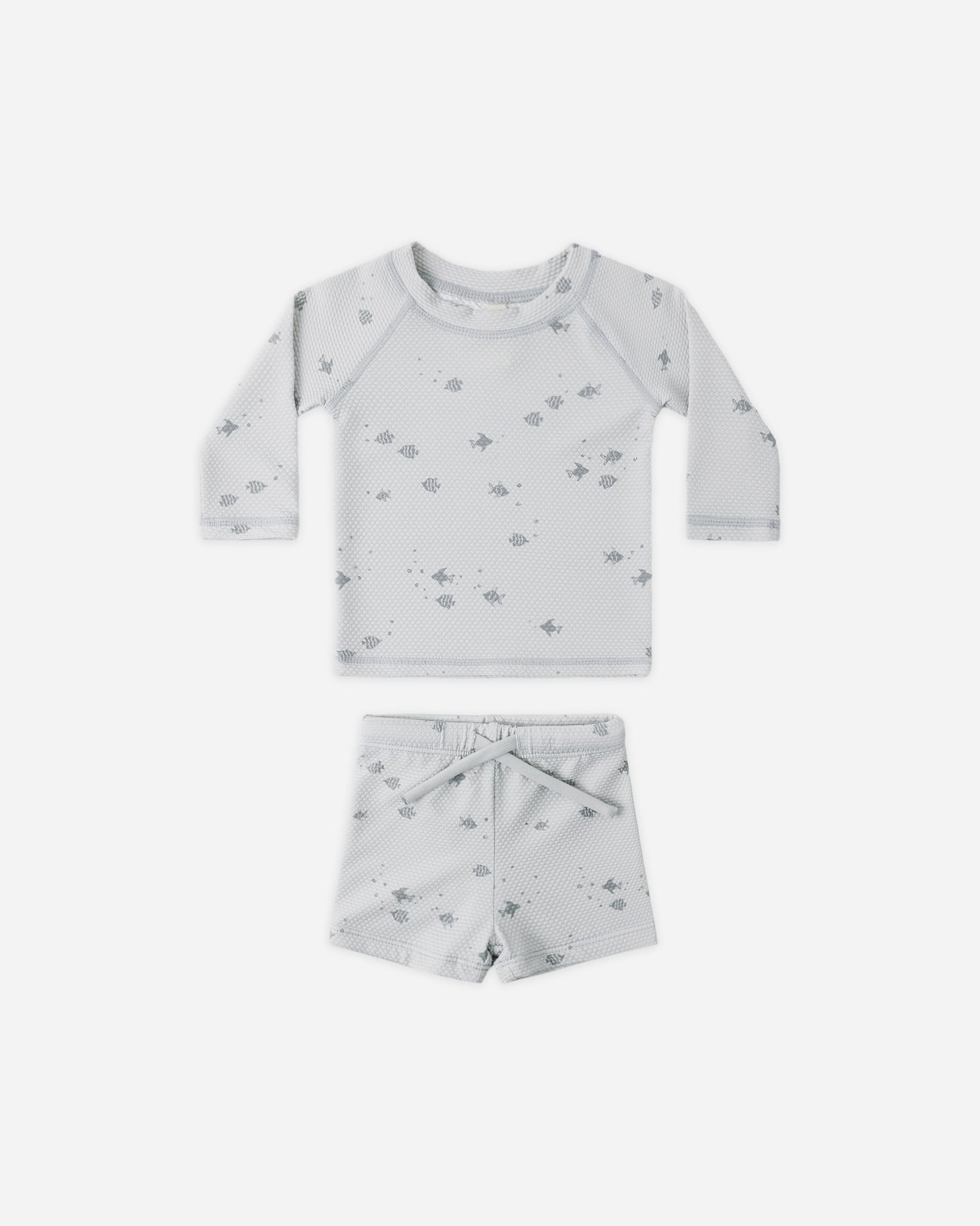 This two-piece rashguard set will keep your little one protected from the sun in style. Featuring a long sleeve rashguard top and coordinating boy short.