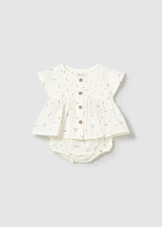An adorable lightweight set by Mayoral! Flutter gauze button down top paired with bloomers complete with ruffles on the back. Ceramic color with faint clusters of mini charcoal heart allover print on both pieces.