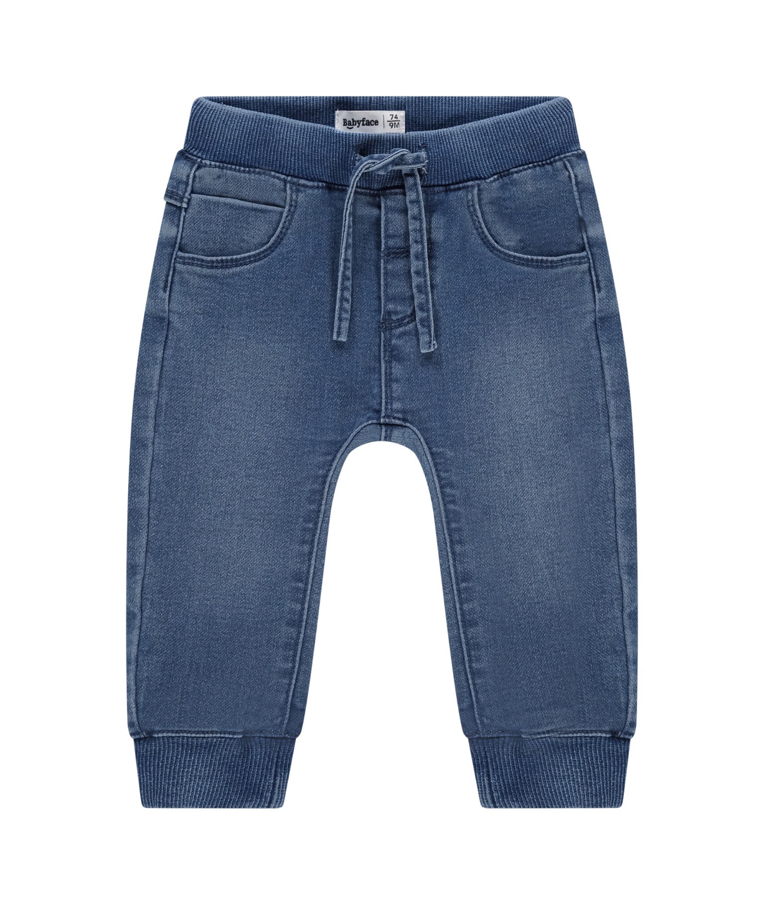Baby & Mama alike- everyone loves this denim! Sweatpant comfort with the look of a classic jean & ease of a jogger. The perfect medium wash with elastic pull-on waistband, drawstring pull detail, faux front fly, pocket accent & tapered leg. Elastic banded bottom hem.
