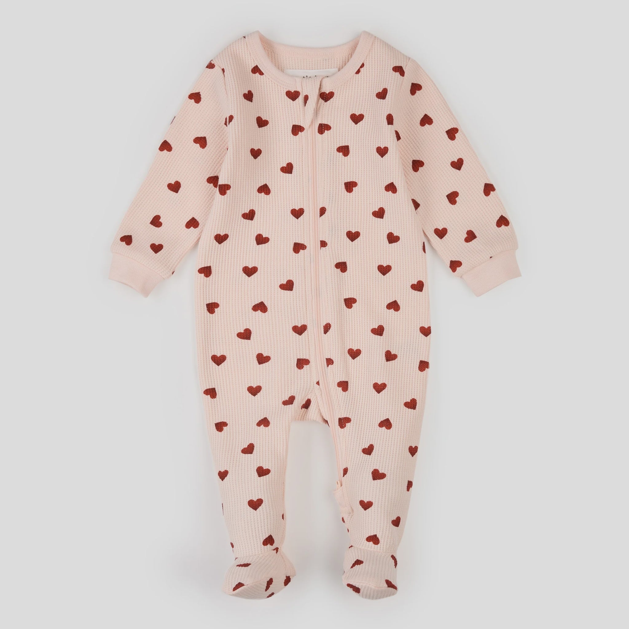 Cozy up to the sweetest month of the year with these thermal footed pajamas. Soft petal pink textured waffle body with rounded neckline, full length sleeves & footed bottom. Two-way zip closure allows for the easiest diaper changes & elastic banding provides the perfect fit. Coordinate with your older siblings with pieces from the collection!