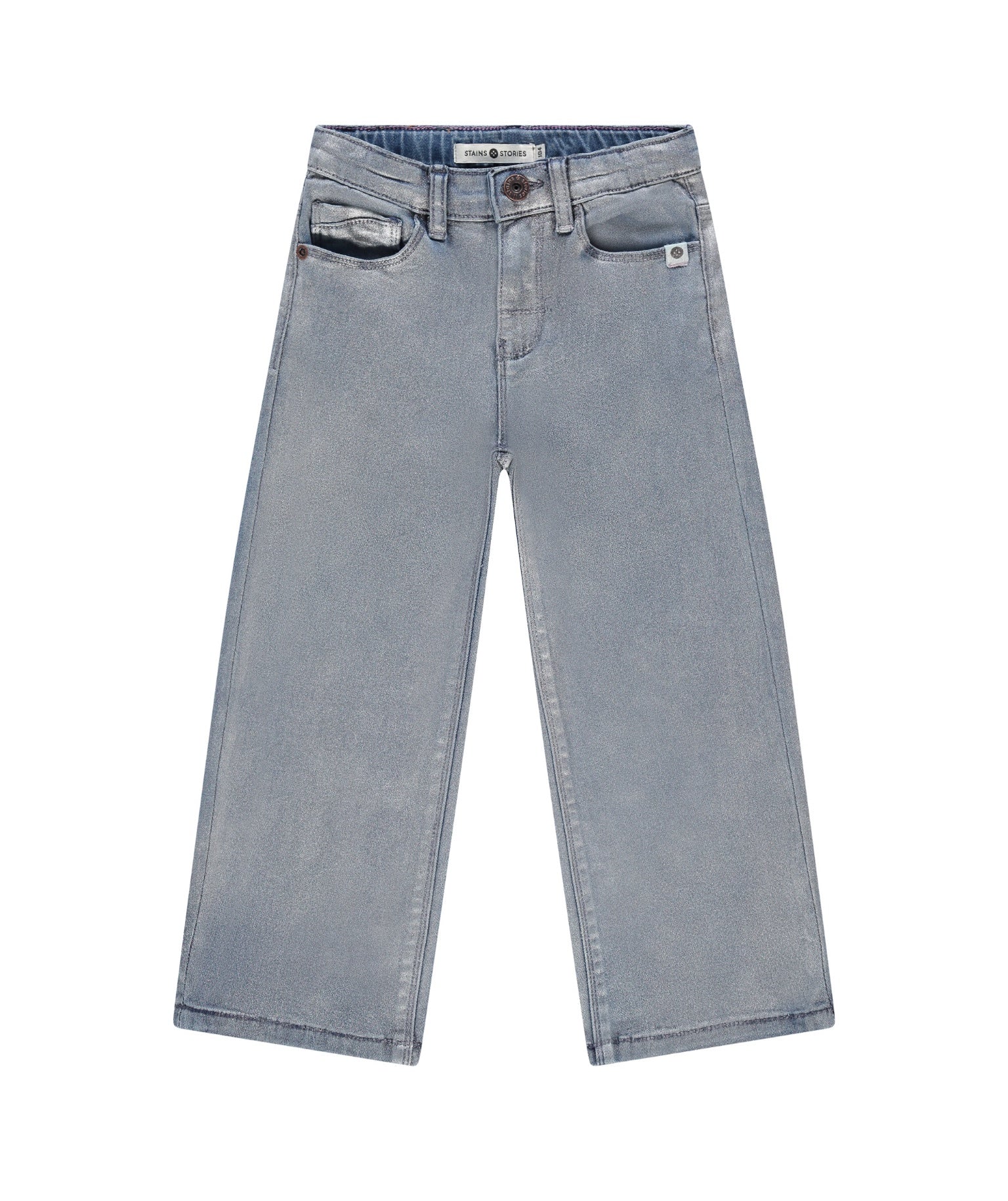Stop, look and listen- these jeans are about to boost your OOTD game! Wide leg denim with a silver coating that makes these sparkle & shine. Soft, comfortable and full of serious sass. Five pocket styling with hidden hook and eye closure & zip fly. Adjustable waist and belt loops for the perfect fit for the perfect diva.